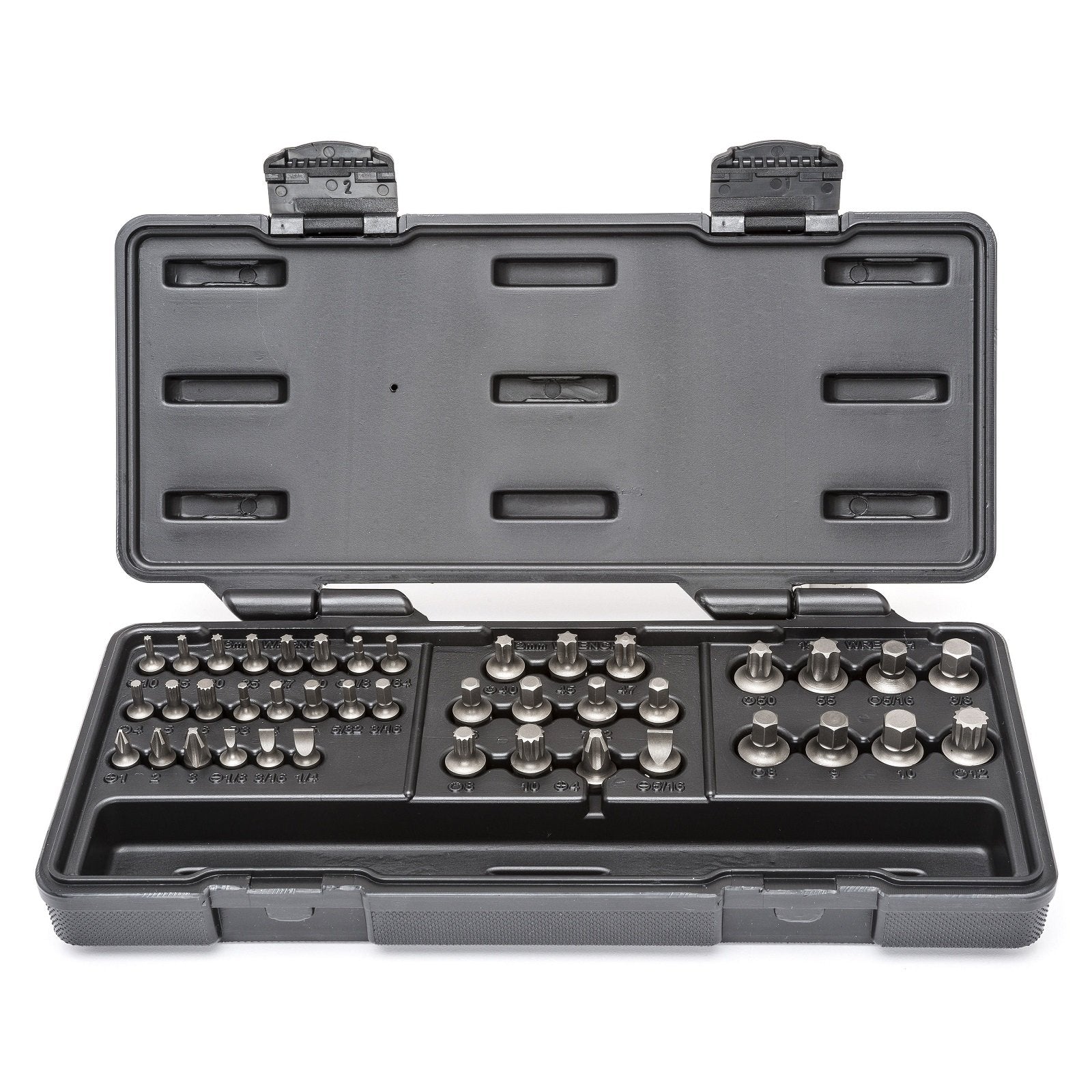 - Contents 11 Torx Bits, 8 Metric Hex Bits, 8 SAE Hex Bits, 6 Triple Square Bits, 4 Phillips Bits, 4 Slotted Bits