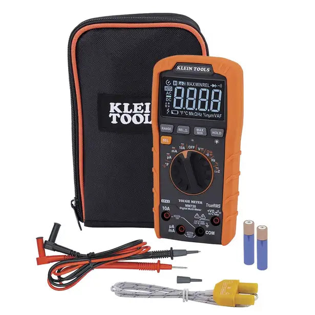Klein Tools MM720 Multimeter is an automatically ranging true root mean squared (TRMS) digital multimeter that measures AC/DC voltage, AC/DC current, and resistance. It can also measure temperature, capacitance, frequency, duty-cycle, diodes and continuity. It features a high visibility, reverse contrast LCD display with an optical sensor to automatically optimize viewability in dark or bright ambient lighting.