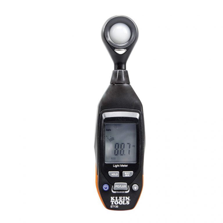 - Klein Tools ET130 is an easy-to-use precision light meter that measures illuminance levels in both Foot Candles (FC) and Lux. Backlit LCD display screen with bar graph assists when monitoring light levels and for retrofit projects. Includes custom carrying pouch and 9V battery