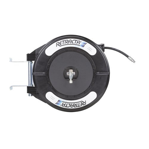RETRACTA R3 Premium spring rewind reel c/w 15m x 1/4" Grease hose, 1/4" BSPF inlet fitting and 1/4" BSPT M hose end. Black case.