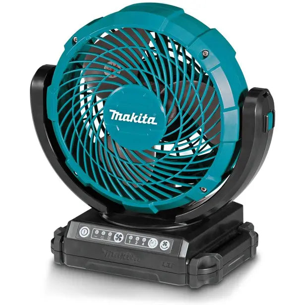 The Makita 18V 180mm Jobsite Fan is a portable and convenient air moving solution for painters, tradesmen, and more. The fan has three speed settings and an oscillation selector for optimal air velocity and control. When using an 18V LXT 6.0Ah battery (BL1860B, sold separately), users get up to 16 hours of continuous run time on the low speed setting. Added features include tilt settings for better direction of air flow. The 3 stage automatic timer has 1 hour, 2 hour and 4 hour power off selection.
