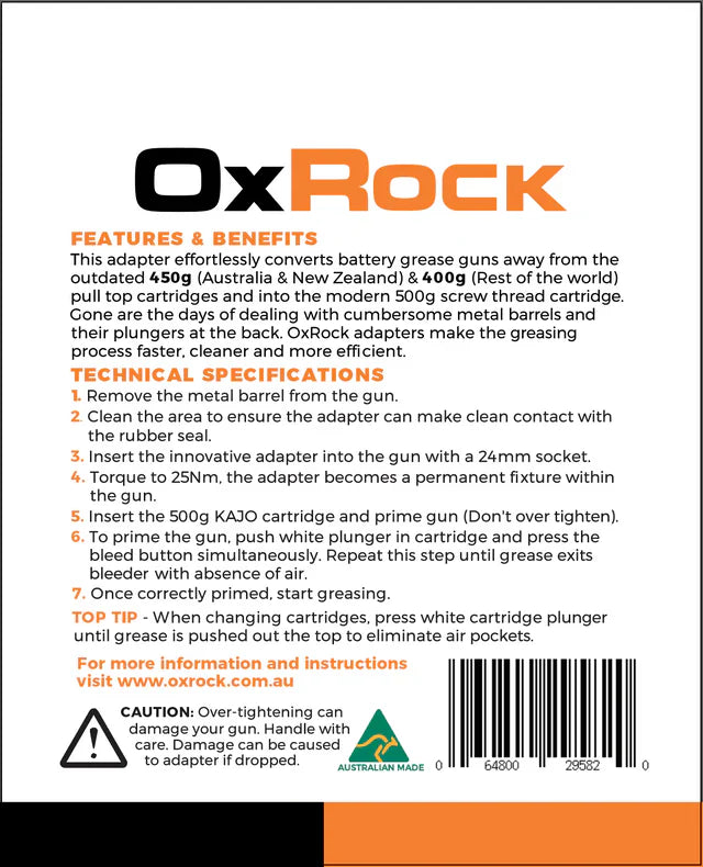 NO MORE MESS This OxRock designed and manufactured adapter makes greasing hassle free. It converts the Metabo 18V grease gun (Australia/New Zealand Models) from use of the old 450g pull off cartridges into the new KAJO 500g screw cartridges. The metal cartridge with the long plunger will no longer be required.
