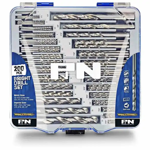 P&N WORKSHOP 1-12MM & 5/64 - 1/2INCH METRIC & IMPERIAL HSS-BRIGHT JOBBER DRILL BIT SET - 200 PIECE